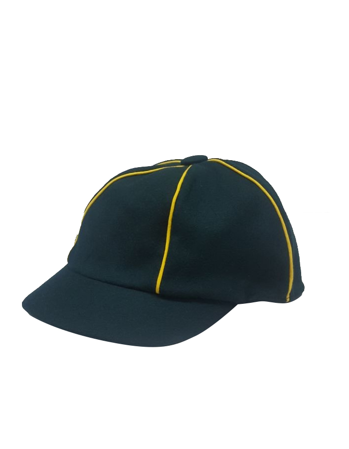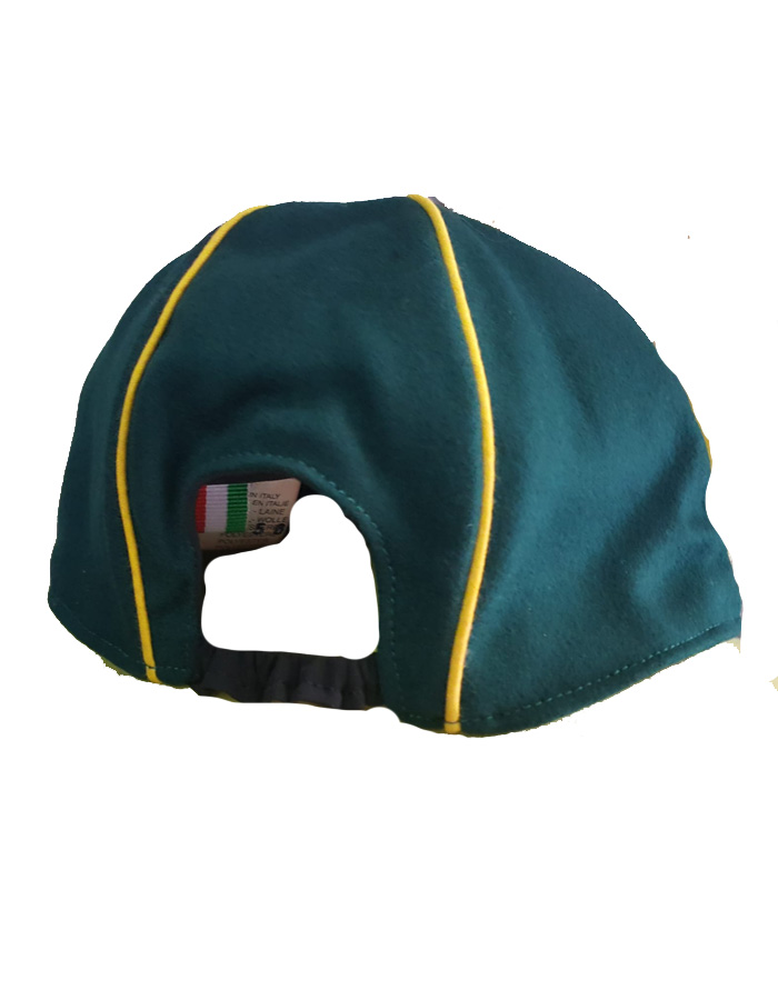 Cappellino Lupetto Scout in pannetto misto lana verde con 5 spicchi divisi da perfilo giallo con visiera rigida e riccetto elastico dietro per una migliore aderenza. Made in Italy