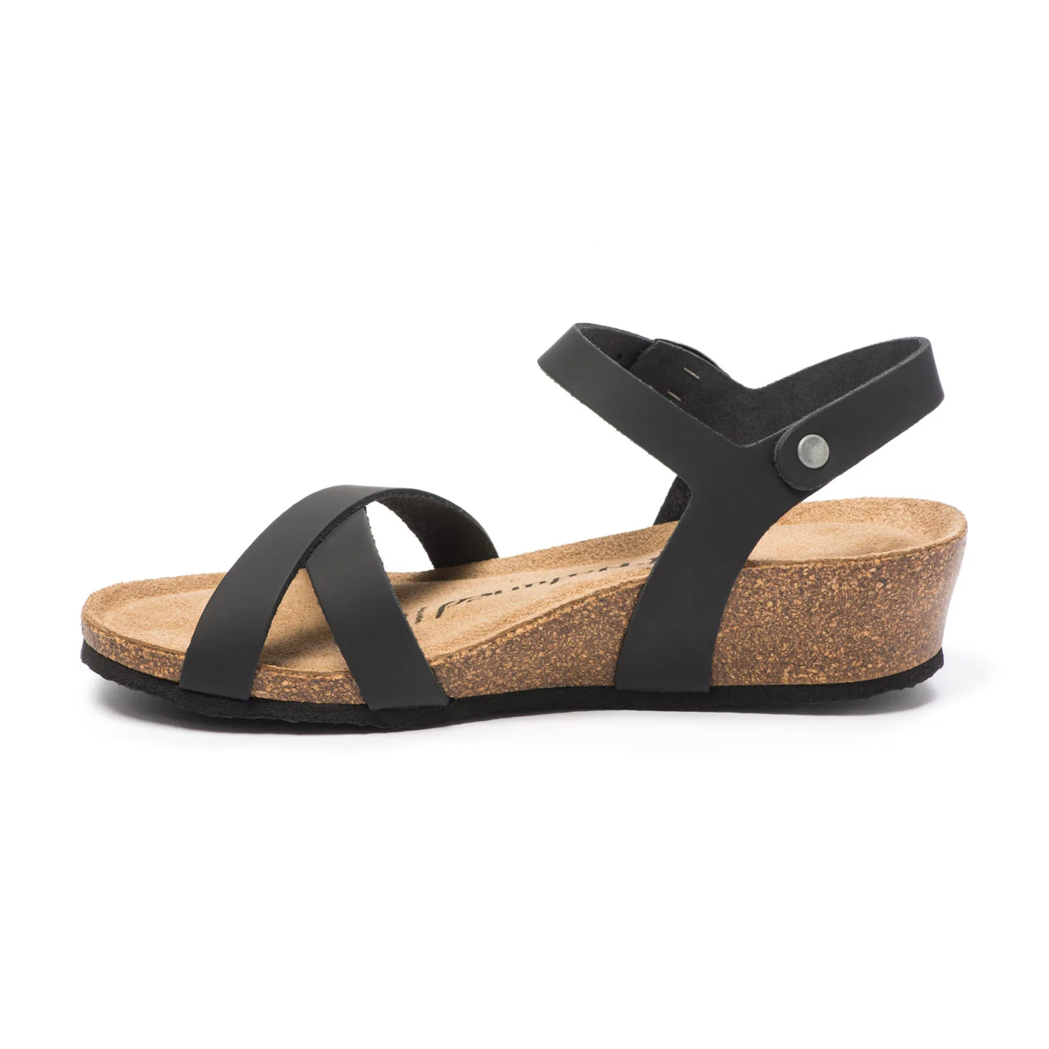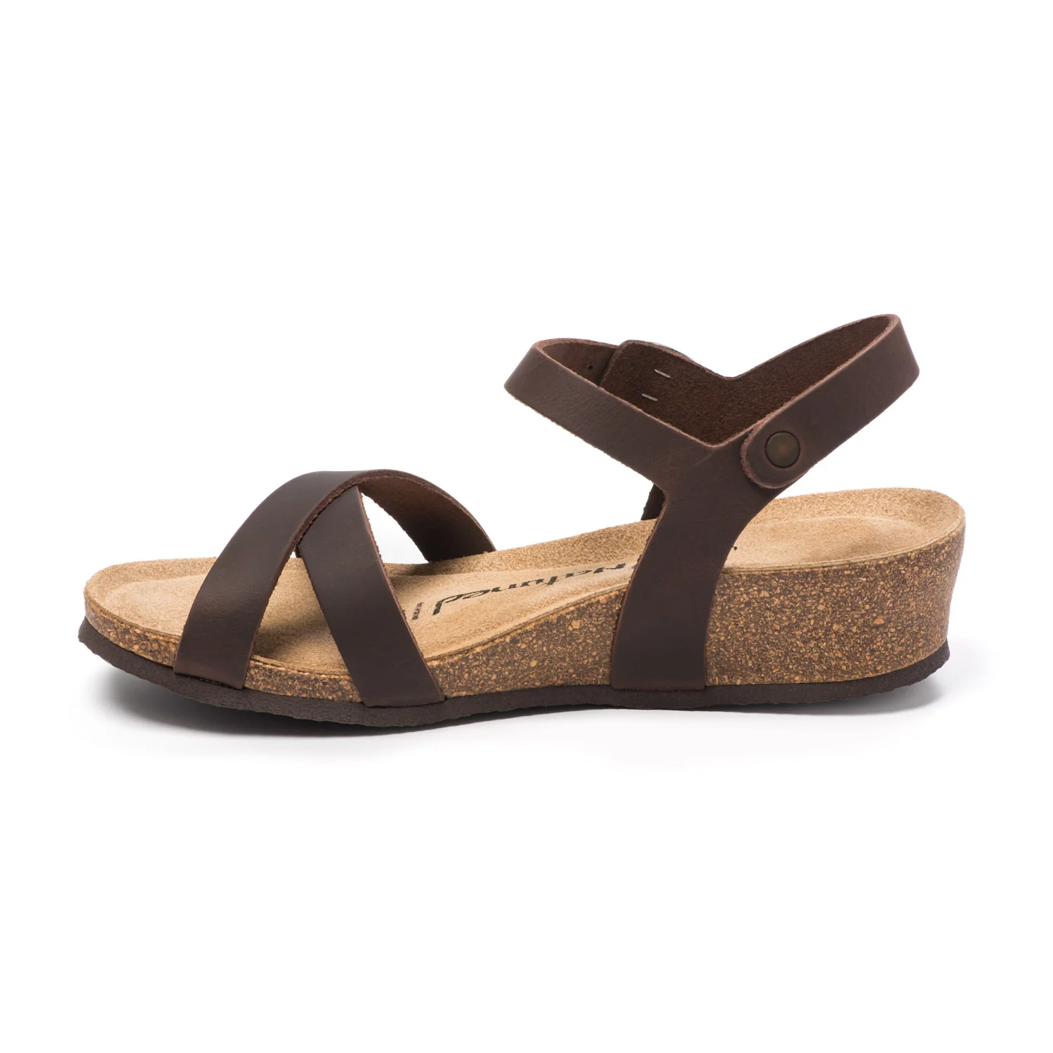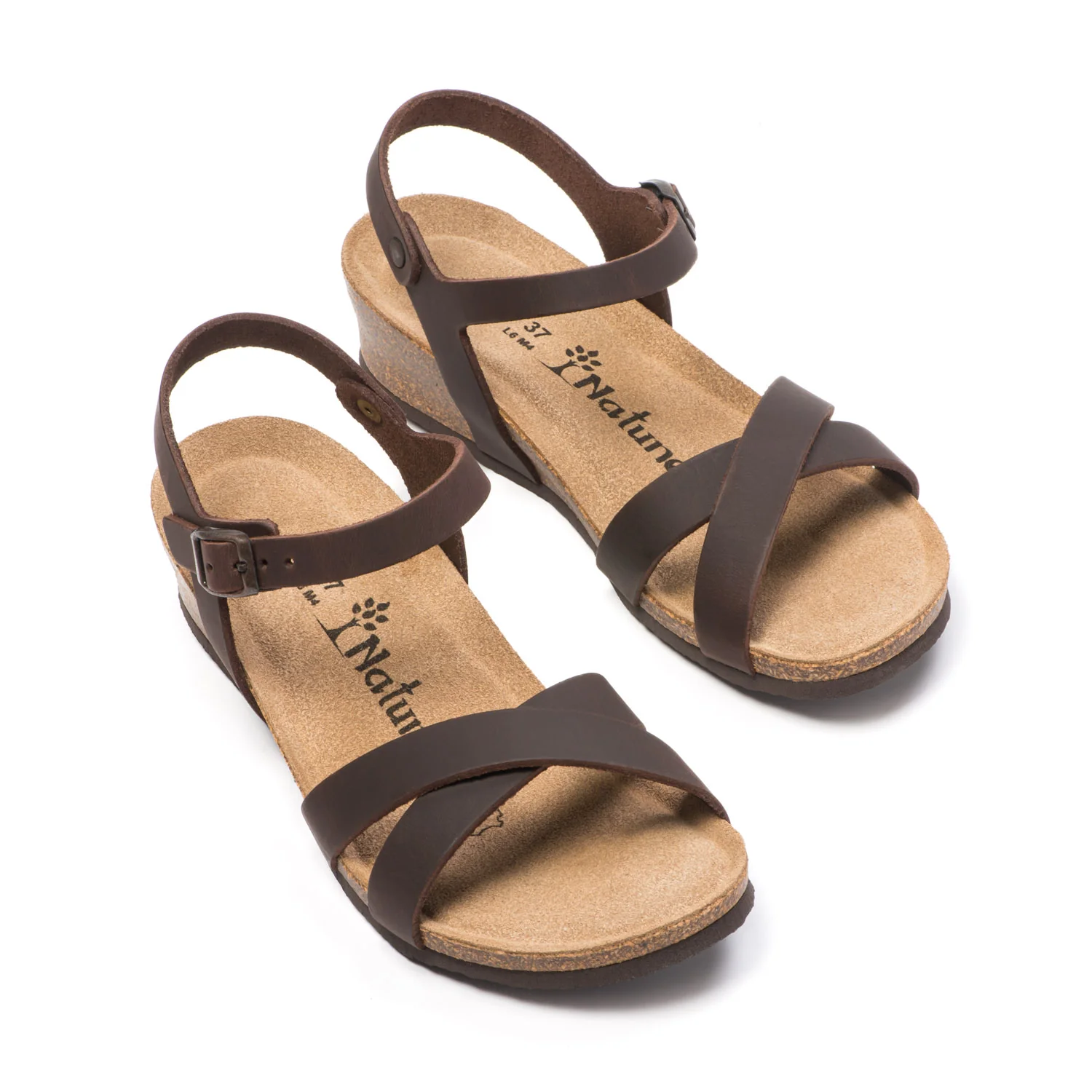 Womenโs sandal with crossed straps and adjustable buckle, handcrafted in Spain by the Natuned brand. The natural leather upper and footbed provide softness and breathability, while the anatomical latex insole ensures lasting comfort. The cork and rubber wedge sole adds lightness, stability, and elegance. The crossed straps enhance the footโs silhouette, making it a perfect choice for both casual and dressy summer outfits. A sandal that combines comfort, craftsmanship, and sustainable style.