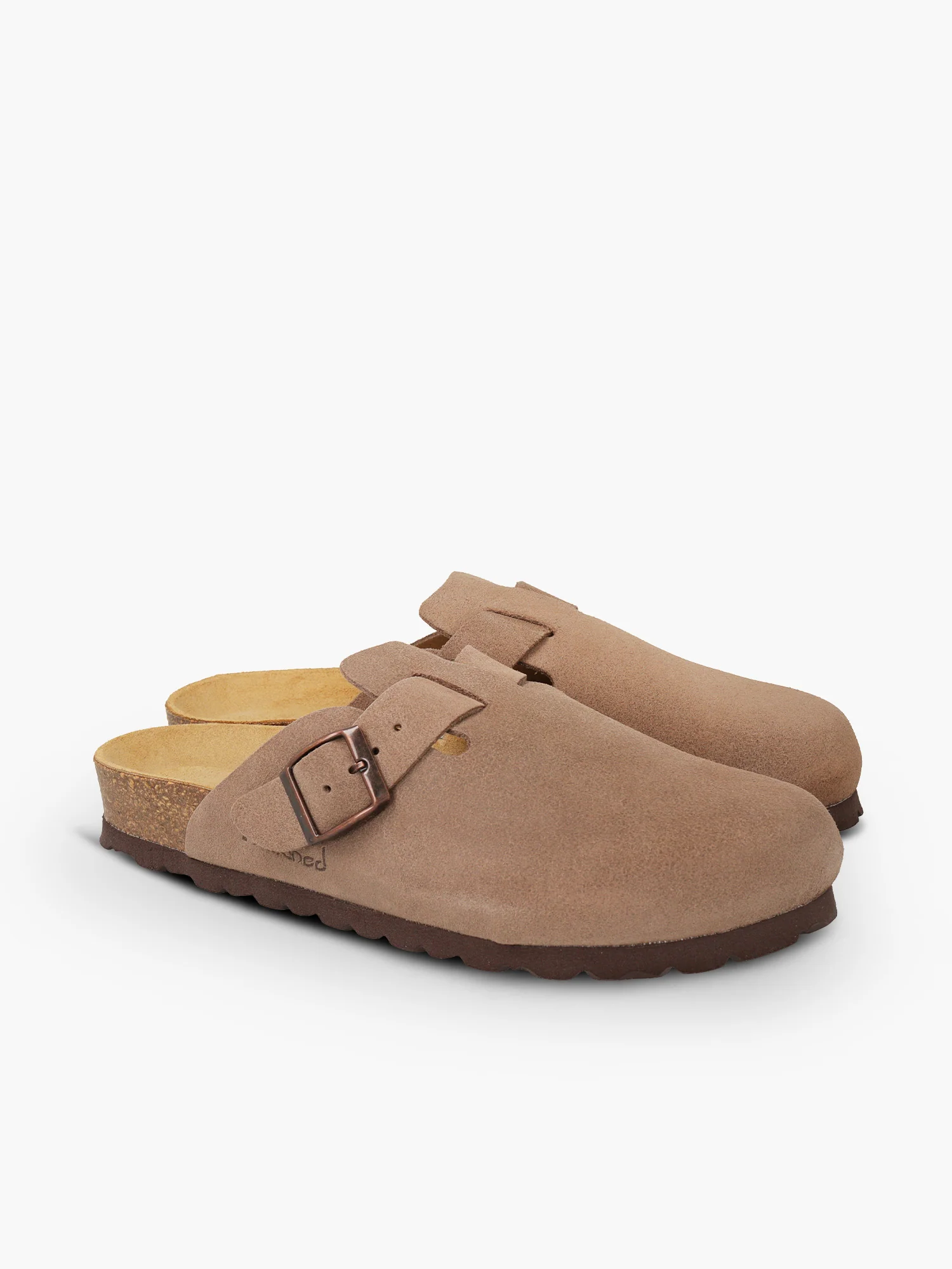 Unisex clog with suede leather upper and adjustable buckle, handcrafted in Spain by the Natuned brand. Soft to the touch and snug on the foot, it offers a secure fit thanks to its adjustable strap. The anatomical latex footbed and leather insole provide natural comfort for everyday wear. The cork and rubber sole delivers lightness, flexibility, and grip. A perfect choice for those seeking a closed yet breathable shoe with a rustic and refined look.