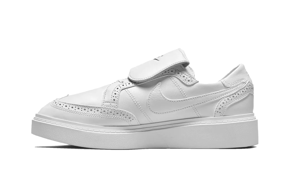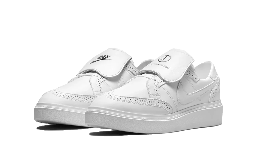 La scarpa vede una tomaia e rinforzi in pelle bianca con dettagli traforati lungo i rinforzi che ne aumentano il look ricercato. La suola completamente bianca viene accompagnata da Swoosh e lacci bianchi. La sneaker si contraddistingue per il prolungamento della linguetta bianco con logo Nike sulla scarpa destra e logo PEACEMINUSONE sulla scarpa sinistra. A completare la silhouette e il branding troviamo anche la famosa margherita ricamata sul tallone e la scritta PEACEMINUSONE sulle estremitร dei lacci.