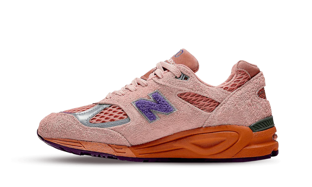 La sneaker vede una tomaia in mesh arancione con rinforzi in pelle scamosciata rosa e pelle viola e argento. La suola si divide in una midsole arancione e verde ed una outsole viola. La N sui lati della tomaia si colora di viola e accompagna una linguetta marrone e dei lacci rosa. La scarpa si completa infine con la scritta 990 New Balance sulla linguetta, N ricamata sul fermalacci e tag New Balance sul lato esterno della tomaia.