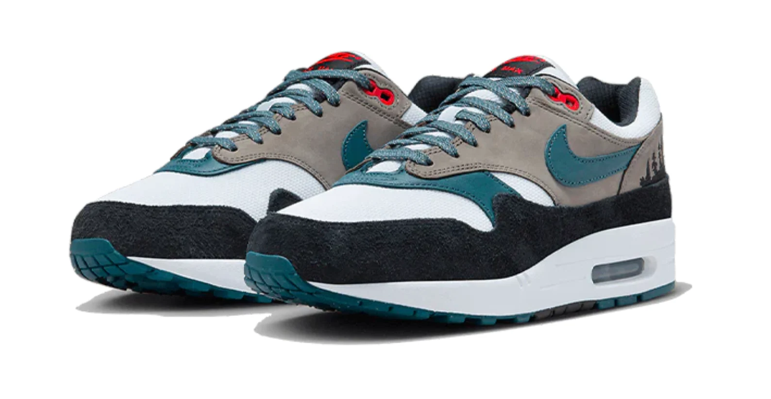 La sneaker vede una tomaia in mesh bianco con rinforzi in pelle blu scura e pelle scamosciata nera e grigia. La suola si divide in una midsole bianca ed una outsole blu scura. Lo Swoosh in pelle blu scura accompagna una linguetta bianca e dei lacci grigi. La pineta ricamata di nero sul tallone completa la scarpa insieme al branding dato dal tag Nike Air Max sulla linguetta e il logo Nike Air presente sul tallone.