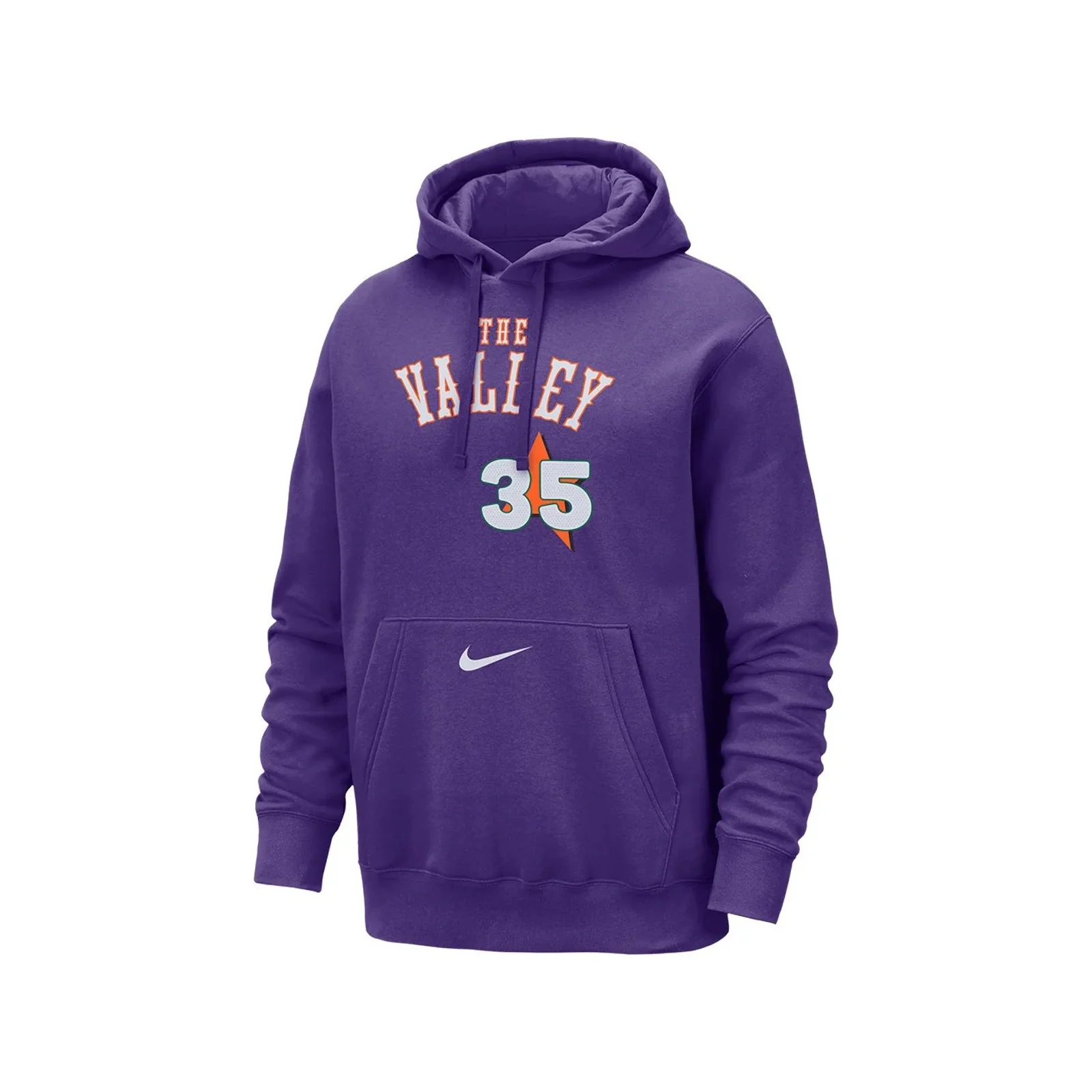 La felpa con cappuccio dei Phoenix Suns City Edition N&N Junior unisce il look della maglia della tua squadra del cuore al comfort del fleece. Realizzata in morbido fleece spazzolato, sfoggia i grintosi colori della squadra con il nome e il numero di Kevin Durant.